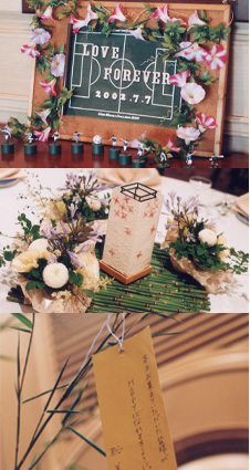 会場装花(ゲストテーブル装花=七夕をイメージした和風に。メインテーブル=新郎が造園学を専攻していたため、式場のフローリストさんと一緒に箱庭を作りました。そこになんと池をつくりメダカも泳がせました。スタンバイのため当日は、新婦より新郎が先に式場入りしました(笑))
